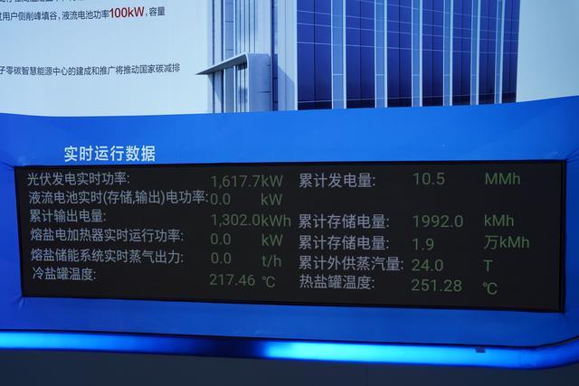 同時(shí),園區(qū)內(nèi)兩個(gè)直徑約4米、長約13米的儲(chǔ)鹽罐可將電能以熱能的形式儲(chǔ)存,在需要用熱時(shí)提供蒸汽熱源。目前,兩個(gè)儲(chǔ)鹽罐的總儲(chǔ)熱達(dá)100吉焦,年供蒸汽超過10000噸,熱電聯(lián)供效率可達(dá)90%。此外,園區(qū)內(nèi)還裝有一個(gè)集成箱式全釩液流電池,該液流電池通過儲(chǔ)存光伏或低谷電能并在用電高峰時(shí)釋放,幫助電網(wǎng)實(shí)現(xiàn)柔性“削峰填谷”。
