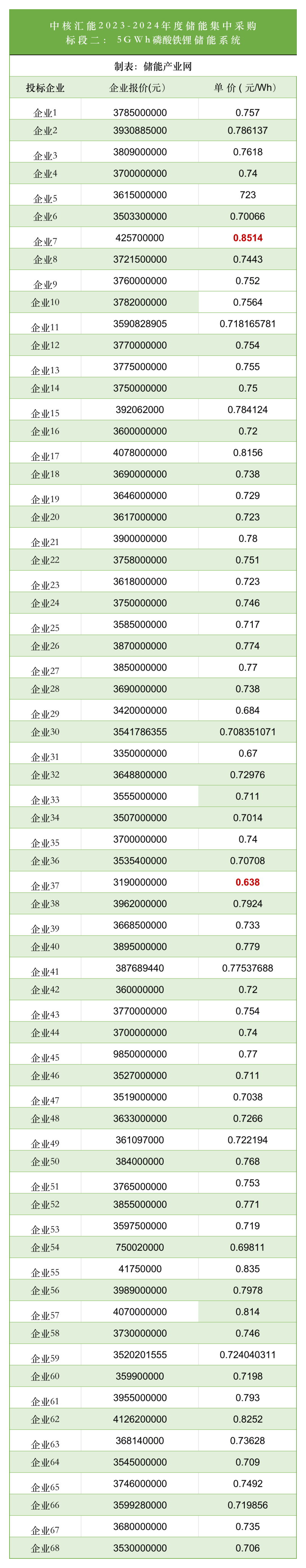 標(biāo)段二:5GWh磷酸鐵鋰儲(chǔ)能系統(tǒng),共有14家企業(yè)入圍,報(bào)價(jià)范圍0.711元/Wh—0.7618元/Wh。