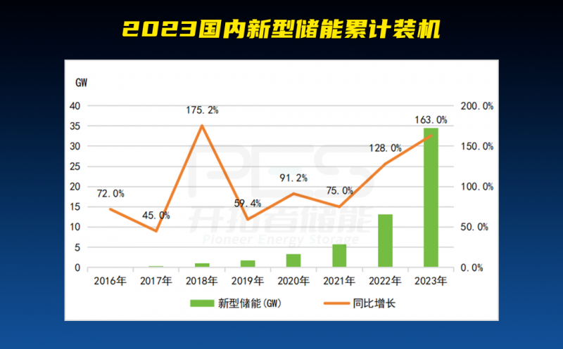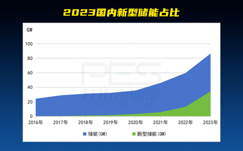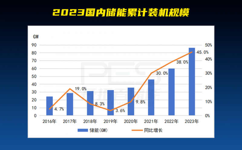 CNESA公布了2023年國內(nèi)儲能的相關數(shù)據(jù)。截至2023年底,我國儲能累計裝機規(guī)模達86.5GW,同比增長45%;新型儲能累計裝機達34.5GW/7