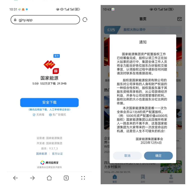 公告稱,近期,有不法分子冒用國家能源集團(tuán)名義發(fā)布“國家能源”“國能在線”等手機(jī)應(yīng)用程序,進(jìn)行所謂“股權(quán)配置”“股權(quán)認(rèn)領(lǐng)”。經(jīng)核實(shí),上述APP非國家能源集團(tuán)發(fā)布,其使用國家能源集團(tuán)名號和商標(biāo)的行為未經(jīng)任何授權(quán),其發(fā)布的一切活動和產(chǎn)品均與國家能源集團(tuán)無關(guān)。