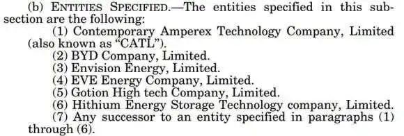 據(jù)彭博新聞社網(wǎng)站1月20日報道,美國已禁止購買中國電池。這項(xiàng)規(guī)定是去年12月22日通過的“2024財年國防授權(quán)法案”的一部分,這項(xiàng)規(guī)定將從2027年10月起開始,規(guī)定禁止美國國防部從寧德時代(CATL)、比亞迪(BYD)和其他四家中國公司采購電池。另外四家包括遠(yuǎn)景能源、億緯鋰能、國軒高科和海辰儲能。
