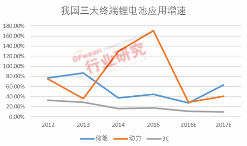 2013年以前3C鋰電應(yīng)用占據(jù)鋰電池市場近90%的市場份額,隨著新能源汽車的高速發(fā)展,這一格局很快被打破,2013年至2016年期間動力電池的銷量以近80%的速度增長,同期鋰電儲能產(chǎn)業(yè)也在市場和政策的推動慢慢成長。OFweek行業(yè)研究中心數(shù)據(jù)顯示,2016年動力電池應(yīng)用量大約21.7Gwh,占鋰電池應(yīng)用總量已超40%,儲能電池應(yīng)用量大約3.8Gwh,增速約為30%。
