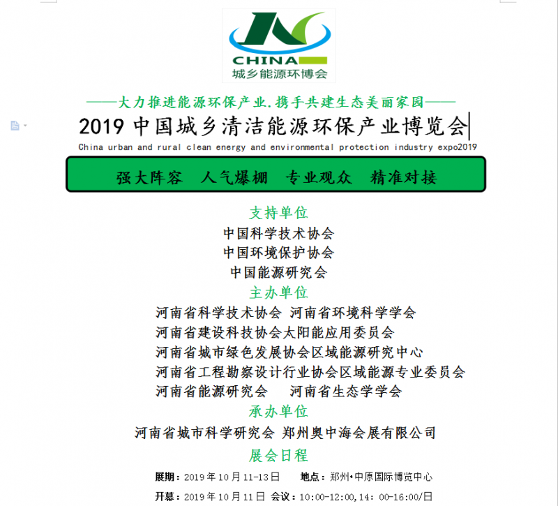 2019中國城鄉(xiāng)清潔能源環(huán)保產(chǎn)業(yè)展,強(qiáng)勢(shì)回歸,在中國·鄭州10月盛大開幕,得到了中國科學(xué)技術(shù)協(xié)會(huì)、中國環(huán)境保護(hù)協(xié)會(huì)、中國能源研究會(huì)、河南省科學(xué)技術(shù)協(xié)會(huì)、河南省環(huán)境科學(xué)學(xué)會(huì)、河南省建設(shè)科技協(xié)會(huì)等單位重點(diǎn)支持、主辦,以及廣大知名企業(yè)和經(jīng)銷商的支持和積極響應(yīng)。大會(huì)立足中部輻射全國,總面積達(dá)20000余平米,專業(yè)觀眾30000余人,屆時(shí)聚千家國內(nèi)外知名企業(yè)歡聚一堂,百余家媒體海量宣傳報(bào)道,打造具有“中國特色”高標(biāo)準(zhǔn)、高品質(zhì)、高規(guī)格”的行業(yè)盛會(huì)。