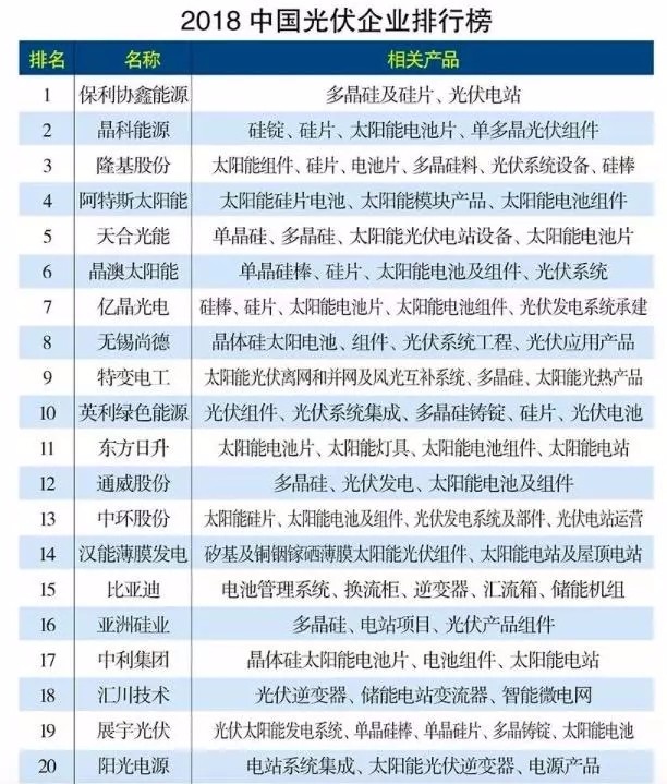 在2018年中國(guó)光伏企業(yè)排行榜中,前十名的光伏企業(yè)分別為保利協(xié)鑫能源、晶科能源、隆基股份、阿特斯太陽能、天合光能、晶澳太陽能、億晶光電、無錫尚德、特變電工、英利綠色能源。其涉及的主營(yíng)業(yè)務(wù)及產(chǎn)品如下表。本文則重點(diǎn)介紹在這些領(lǐng)先企業(yè)之外,在產(chǎn)業(yè)鏈各端占據(jù)絕對(duì)優(yōu)勢(shì)地位的“小巨頭”企業(yè)。