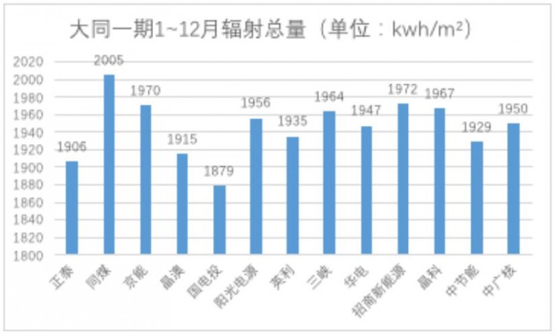 通過上圖可以看出,國電投、正泰、晶澳的全年輻射總量最低,招商新能源與同煤的全年輻射總量最高;在相應的發(fā)電量表現(xiàn)上,招商與同煤兩家的發(fā)電量自然遙遙領先,而國電投與晶澳則相對較低。