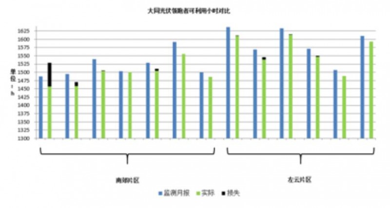 從上圖可以看出,南郊片區(qū)粉塵較大,左云片區(qū)粉塵較少,由此也導致了南郊片區(qū)光伏方陣受陰影遮擋影響更大,電站發(fā)電量相對偏低。結合上圖重新整理后的發(fā)電圖表(按片區(qū)重新劃分),位于南郊片區(qū)的7個項目,相比左云片區(qū)的其余6個項目,受遮擋影響的發(fā)電損失表現(xiàn)更為嚴重。