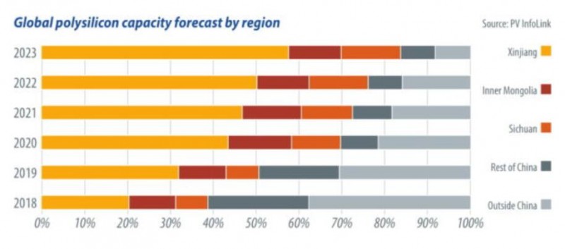 到目前為止,全球多晶硅產(chǎn)能已達(dá)到119,000公噸(MT),比2018年第四季度的10.6萬(wàn)噸增加了12%。年底中國(guó)西部和西北部的新增產(chǎn)能將占全球多晶硅產(chǎn)能的一半。