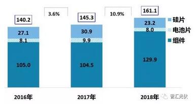 然而,這些貿(mào)易摩擦讓中國光伏企業(yè)越戰(zhàn)越強(qiáng),出口額逐年上升。根據(jù)中國光伏行業(yè)協(xié)會的統(tǒng)計(jì),盡管2018年光伏產(chǎn)品的單價(jià)下降30%,但出口額增加10%以上。近3年的光伏產(chǎn)品出口額如下圖所示。