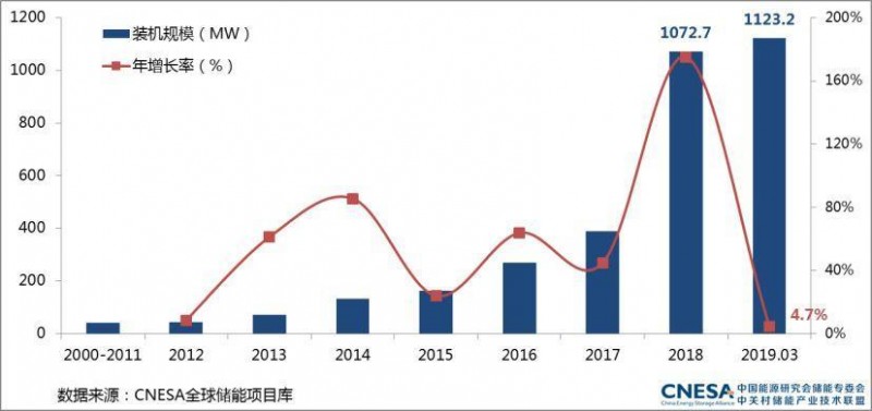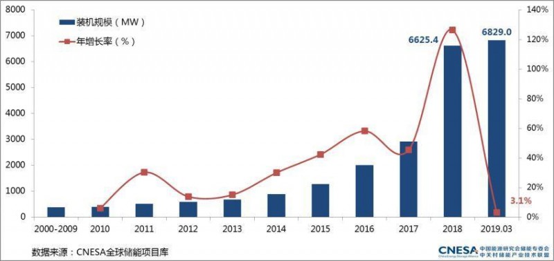 根據(jù)中國(guó)能源研究會(huì)儲(chǔ)能專委會(huì)/中關(guān)村儲(chǔ)能產(chǎn)業(yè)技術(shù)聯(lián)盟(CNESA)的不完全統(tǒng)計(jì),截至2019年3月底,全球已投運(yùn)儲(chǔ)能項(xiàng)目的累計(jì)裝機(jī)規(guī)模為181.2GW,同比增長(zhǎng)3.2%。其中,電化學(xué)儲(chǔ)能的累計(jì)裝機(jī)規(guī)模為6829.0MW,占全球市場(chǎng)的3.8%,同比增長(zhǎng)104.0%,較2018年底增長(zhǎng)了3.1%。