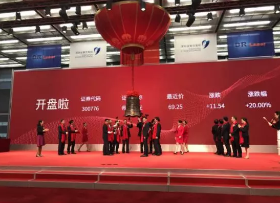 武漢帝爾激光科技股份有限公司周五上市掛牌儀式在深圳證券交易所舉行,股票簡(jiǎn)稱“帝爾激光”,股票代碼“300776”,保薦機(jī)構(gòu)和主承銷商為長(zhǎng)江證券承銷保薦有限公司。本次公開發(fā)行股票總數(shù)量1,653.60萬股,發(fā)行價(jià)格為57.71元/股,新股募集資金總額為95,429.26萬元。隨著開市寶鐘的敲響,帝爾激光正式登陸A股市場(chǎng),開啟資本市場(chǎng)新征程。