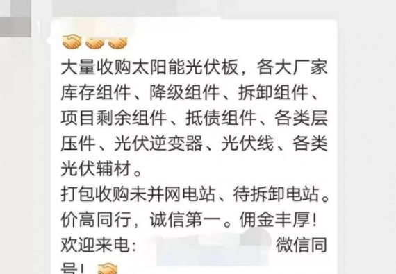 混各種光伏群的人,可能會(huì)經(jīng)??吹接腥嗽谌豪锇l(fā)布各種,收購(gòu)或者出售拆卸光伏組件的信息,類似下圖這種。