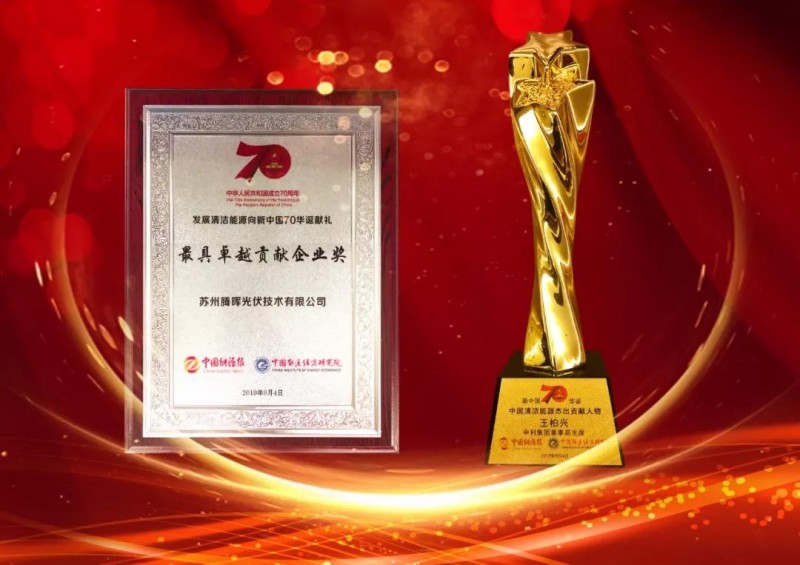 作為本屆博覽會(huì)重要內(nèi)容之一,在同期舉行“致敬七十年·清潔能源創(chuàng)新發(fā)展盛典”頒獎(jiǎng)典禮上,中利集團(tuán)董事局主席王柏興憑借近年來在推動(dòng)清潔能源發(fā)展、光伏扶貧、社會(huì)責(zé)任、經(jīng)濟(jì)環(huán)境效益等方面所做出的杰出貢獻(xiàn),榮膺“2019中國清潔能源杰出貢獻(xiàn)人物”。騰暉光伏榮獲“2019最具卓越貢獻(xiàn)企業(yè)獎(jiǎng)”。