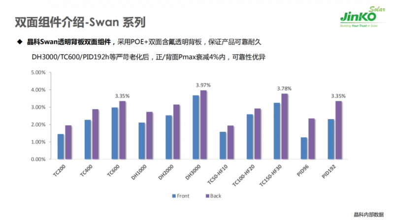多重優(yōu)勢(shì)讓大家對(duì)晶科的雙面組件充滿信心,但他們?yōu)楹芜x擇透明背板技術(shù)路線?產(chǎn)品可靠性能否保證?劉曉穎指出,減重只是Swan系列組件核心優(yōu)勢(shì)的一個(gè)方面,該產(chǎn)品采用POE+雙面含氟透明背板,保證其耐濕熱、耐磨損的特性,“經(jīng)過DH3000/TC600/PID192h等嚴(yán)苛老化試驗(yàn)后,組件正/背面峰值功率衰減都在4%以內(nèi),可靠性得到了充分驗(yàn)證。”