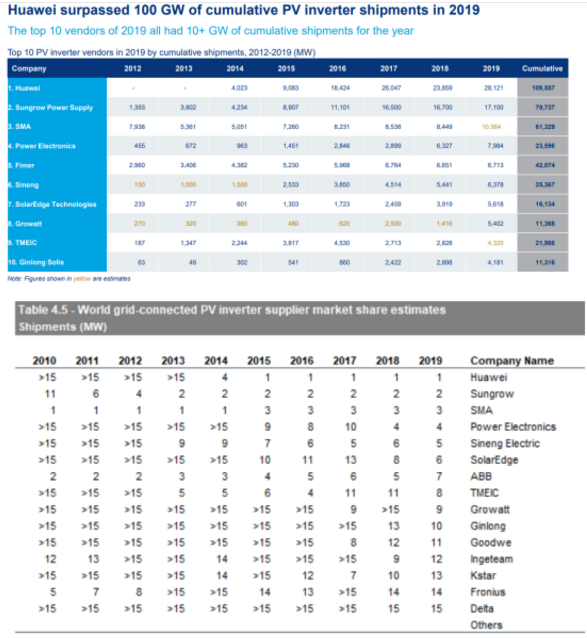 近日,多家機(jī)構(gòu)相繼發(fā)布2019年逆變器出貨量排名報(bào)告。其中,Wood Mackenzie發(fā)布的Global solar PV and MLPE inverter market 2020報(bào)告顯示,2019年全球光伏逆變器出貨量前2位均是中國(guó)企業(yè),其中排名第一的華為2019年出貨量約28.121GW,累計(jì)出貨量109.557GW,穩(wěn)居全球首位;IHS Markit報(bào)告也指出,2019年全球逆變器出貨TOP10企業(yè)中,有5家是中國(guó)企業(yè),華為更是連續(xù)5年蟬聯(lián)冠軍,王者地位不可撼動(dòng)。