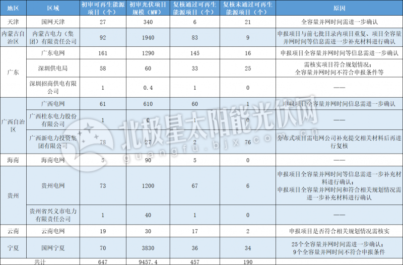 近日,國(guó)家可再生能源信息管理中心發(fā)布可再生能源電價(jià)附加補(bǔ)貼清單申報(bào)項(xiàng)目復(fù)核工作開展情況,截止6月4日,天津、內(nèi)蒙古自治區(qū)、廣東、廣西自治區(qū)、海南、貴州、云南、寧夏8地的可再生能源電價(jià)附加補(bǔ)貼清單申報(bào)項(xiàng)目復(fù)核工作中,共涉及647個(gè)可再生能源項(xiàng)目,其中初審?fù)ㄟ^的光伏項(xiàng)目總規(guī)模達(dá)9457.4MW。經(jīng)統(tǒng)計(jì),共457個(gè)可再生能源項(xiàng)目通過復(fù)核,復(fù)核未通過的有190個(gè)。其中廣西新電力投資集團(tuán)有限公司經(jīng)營(yíng)區(qū)域未通過復(fù)核的可再生能源項(xiàng)目最多,為76個(gè)。復(fù)核未通過原因多為全容量并網(wǎng)時(shí)間需進(jìn)一步確認(rèn)、不符合申報(bào)條件等因素。