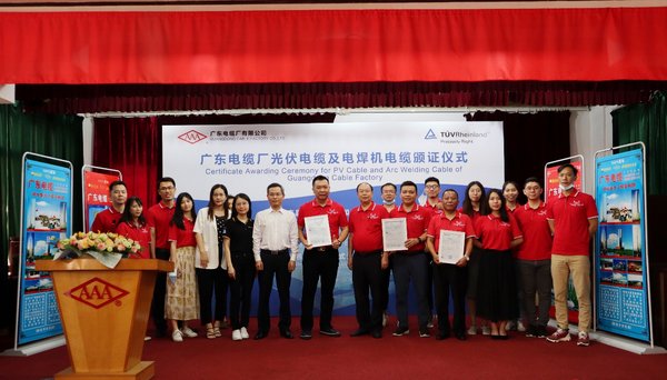 廣州2020年6月29日 /美通社/ -- 近日,德國萊茵TUV集團(tuán)(以下簡稱“TUV萊茵”)為廣東電纜廠有限公司(以下簡稱“廣東電纜廠”)的光伏電纜和電焊機(jī)電纜頒發(fā)了TUV萊茵型式認(rèn)證證書,標(biāo)志著廣東電纜廠生產(chǎn)的電焊機(jī)電纜已滿足歐盟的相關(guān)法令法規(guī),其光伏電纜同時(shí)滿足TUV萊茵2PfG標(biāo)準(zhǔn)和歐盟EN標(biāo)準(zhǔn)要求。