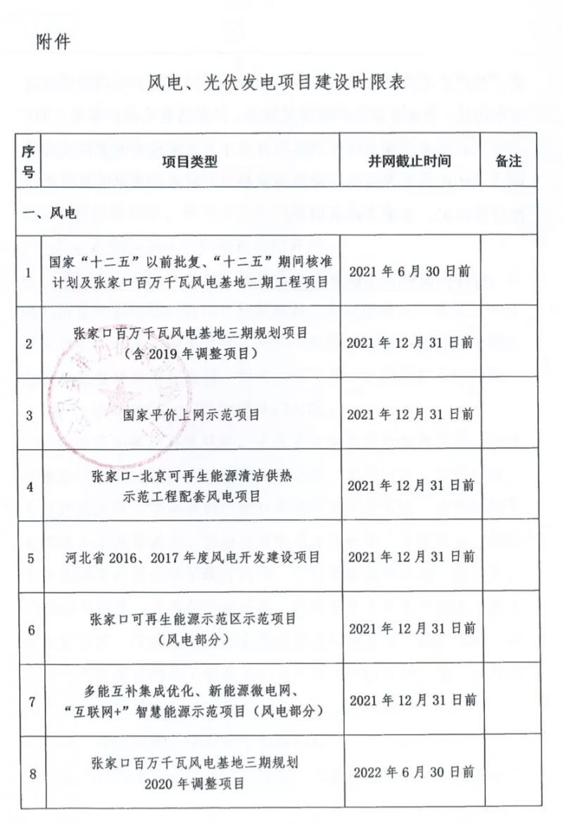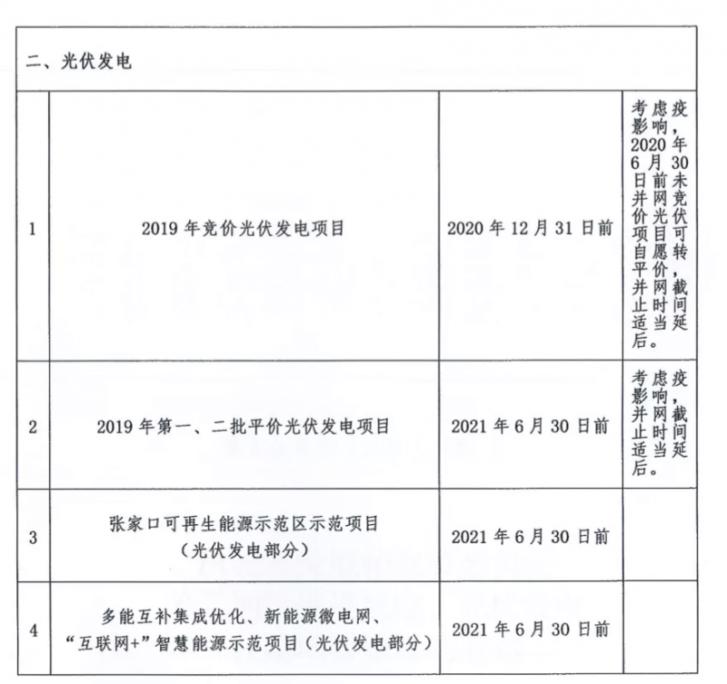 此外,張家口可再生能源示范項目(光伏發(fā)電部分)、多能互補(bǔ)集成優(yōu)化、新能源微電網(wǎng)、“互聯(lián)網(wǎng)+”智慧能源示范項目(光伏發(fā)電部分)這三大類項目的并網(wǎng)截止時間為2021年6月30日。