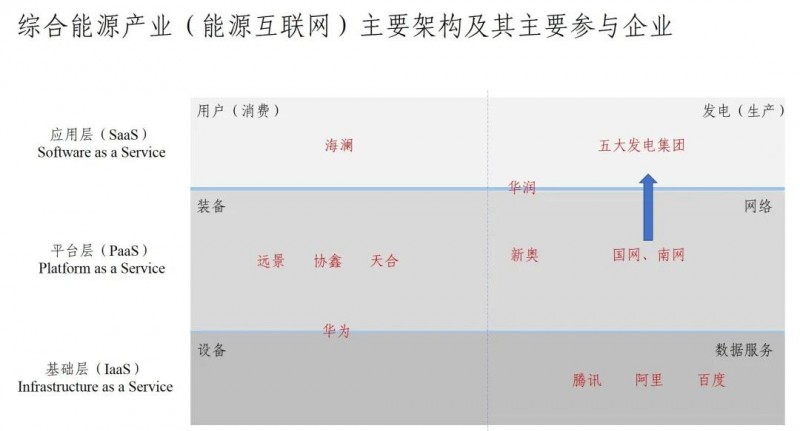 目前,一個(gè)折中的方案是將系統(tǒng)平臺(tái)進(jìn)行社會(huì)分工,我分成三個(gè)層次,應(yīng)用層(SaaS,Software as a Service)、平臺(tái)層(PaaS,Platform as aService)和基礎(chǔ)設(shè)施層(IaaS,Infrastructure as a Service),目前參與綜合能源產(chǎn)業(yè)(能源互聯(lián)網(wǎng))的主要企業(yè)均可以在這種分工中找到相應(yīng)的位置所示(如下圖)。