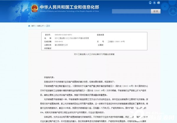 “實踐證明,允許合法合規(guī)開展產(chǎn)能置換新建光伏玻璃項目,不僅有助于行業(yè)技術(shù)進步和結(jié)構(gòu)調(diào)整,而且也有助于推動整個玻璃行業(yè)化解過剩產(chǎn)能工作。” 10月26日,工信部原材料工業(yè)司對十三屆全國人大代表許繼偉向十三屆全國人大三次會議提交的第6572號建議 (關(guān)于光伏玻璃行業(yè)實施產(chǎn)能置換的建議)作出公開答復(fù)(工信建議【2020】167號)。