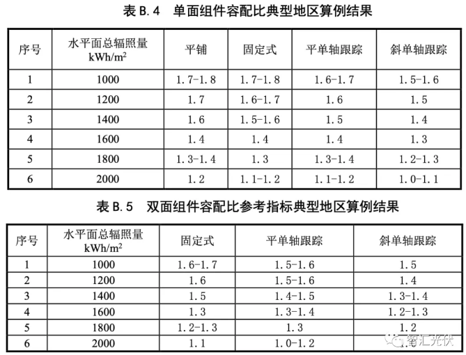 在剛剛批準(zhǔn)并新實施的“能效標(biāo)準(zhǔn)”中,根據(jù)1)項目所在地的輻照度、2)項目采取的技術(shù)路線、3)項目采用的組件類型,對容配比采取了新的規(guī)定,最高可達(dá)到1.8:1,如表B.4所示。