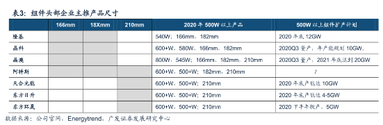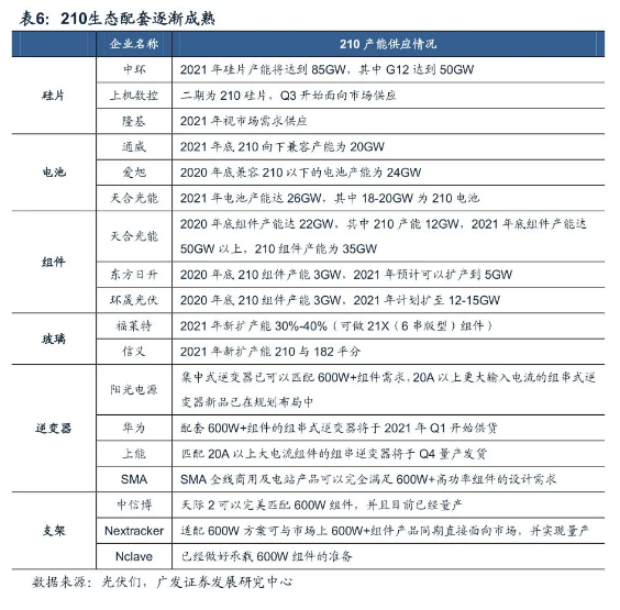 硅片方面,中環(huán)股份作為光伏硅片領(lǐng)域龍頭,最早于行業(yè)內(nèi)推出210尺寸硅片產(chǎn)品。目前公司共有硅片產(chǎn)能51GW,其中包括18GW的210硅片產(chǎn)能。預(yù)計(jì)2020年底公司硅片總產(chǎn)能將達(dá)到55GW,210尺寸產(chǎn)能達(dá)到19GW,2021年底公司硅片總產(chǎn)能預(yù)計(jì)達(dá)到85GW,其中G12達(dá)到50GW。上機(jī)數(shù)控2期8GW單晶硅片均為210尺寸產(chǎn)品,已經(jīng)于2020Q3面向市場(chǎng)供應(yīng)。2020年8月5日京運(yùn)通自主開(kāi)發(fā)的210尺寸大硅片試產(chǎn)成功,開(kāi)始進(jìn)行批量化生產(chǎn),此外,公司近日公告將在樂(lè)山建設(shè)24GW的210硅片產(chǎn)線(xiàn),其中一期12GW拉棒、切方項(xiàng)目計(jì)劃2020年四季度開(kāi)工,二期12GW拉棒、切方項(xiàng)目在一期項(xiàng)目達(dá)產(chǎn)后兩年內(nèi)投產(chǎn)。 電池方面:通威股份作為全球最大獨(dú)立第三方電池供應(yīng)企業(yè),眉山一期、眉山二期、金堂一期各7.5GW產(chǎn)能全面兼容210尺寸電池,眉山一期產(chǎn)能已經(jīng)于2020年4月投產(chǎn),眉山二期及金堂一期計(jì)劃分別于2021年4月及一季度投產(chǎn),屆時(shí)通威股份210尺寸電池產(chǎn)能將達(dá)到22.5GW。愛(ài)旭股份截至2020年上半年擁有電池產(chǎn)能約15GW,其中210產(chǎn)能約5GW,隨著義烏三、四、五及天津二期產(chǎn)能投產(chǎn),2020年底公司電池總產(chǎn)能22GW,其中210電池產(chǎn)能將達(dá)到10GW,2021Q1電池總產(chǎn)能36GW,其中210產(chǎn)能24GW。天合光能大尺寸電池主要匹配自身組件出貨需求,根據(jù)2020年中報(bào),公司預(yù)計(jì)在2021年底電池總產(chǎn)能達(dá)到26GW左右,其中210mm大尺寸電池產(chǎn)能占比達(dá)到70%左右。 組件方面:天合光能作為全球組件龍頭,公司2020年中報(bào)顯示,在2020年底組件總產(chǎn)能預(yù)計(jì)能達(dá)到22GW左右,2021年底組件總產(chǎn)能預(yù)計(jì)能達(dá)到50GW左右,2021年組件出貨量預(yù)計(jì)30-35GW,其中210尺寸產(chǎn)品出貨約26GW。東方日升截至2020年上半年組件產(chǎn)能12.6GW,公司預(yù)計(jì)2021年210組件出貨量5GW左右。 玻璃方面:目前210出貨以500W/545W產(chǎn)品為主,這兩款組件產(chǎn)品尺寸基本與182組件相差不大,受玻璃產(chǎn)能制約較小。對(duì)于600+W的210組件產(chǎn)品,組件寬度需要達(dá)到1.3米,對(duì)于新建玻璃產(chǎn)線(xiàn)才具備大尺寸玻璃供應(yīng)能力。根據(jù)對(duì)信義光能、福萊特、亞瑪頓、南玻A等廠家擴(kuò)產(chǎn)情況的統(tǒng)計(jì),2020-2022年玻璃新投產(chǎn)能規(guī)模預(yù)計(jì)2.18萬(wàn)噸/天,其中截至2020年底/2021Q1/2021年底新增玻璃產(chǎn)能分別為4650噸/9000噸/17000噸/天,按3.2mm厚度,分別對(duì)應(yīng)34GW/66GW/124.5GW的大尺寸組件需求(玻璃產(chǎn)能從投產(chǎn)到產(chǎn)出/滿(mǎn)產(chǎn)/理想情況分別約歷時(shí)1個(gè)月/2個(gè)月/4-6個(gè)月)。