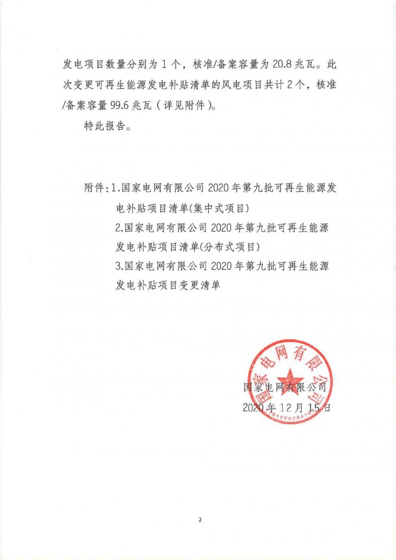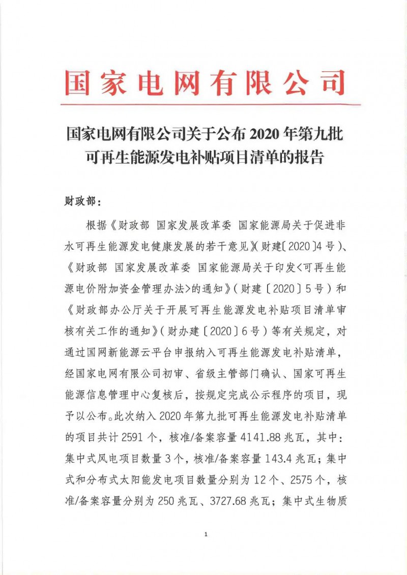 關(guān)于公布2020年第九批可再生能源發(fā)電