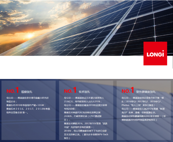 隆基股份成立于2000年,是全球最具價(jià)值的太陽能科技公司。2016-2018年單晶組件出貨量全球第一,單晶PERC電池轉(zhuǎn)化效率達(dá)到24.06%打破世界紀(jì)錄,并蟬聯(lián)2016、2017年TUV萊茵“質(zhì)勝中國”光伏組件發(fā)電仿真第一。