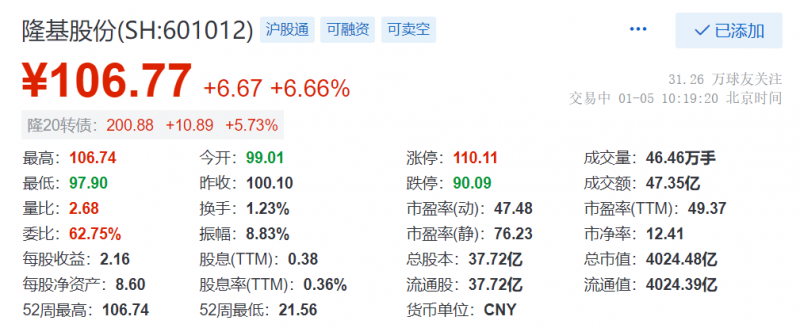 2021年1月5日,隆基股份(SH:601012)股價沖上106.77元,總市值首次突破4000億!