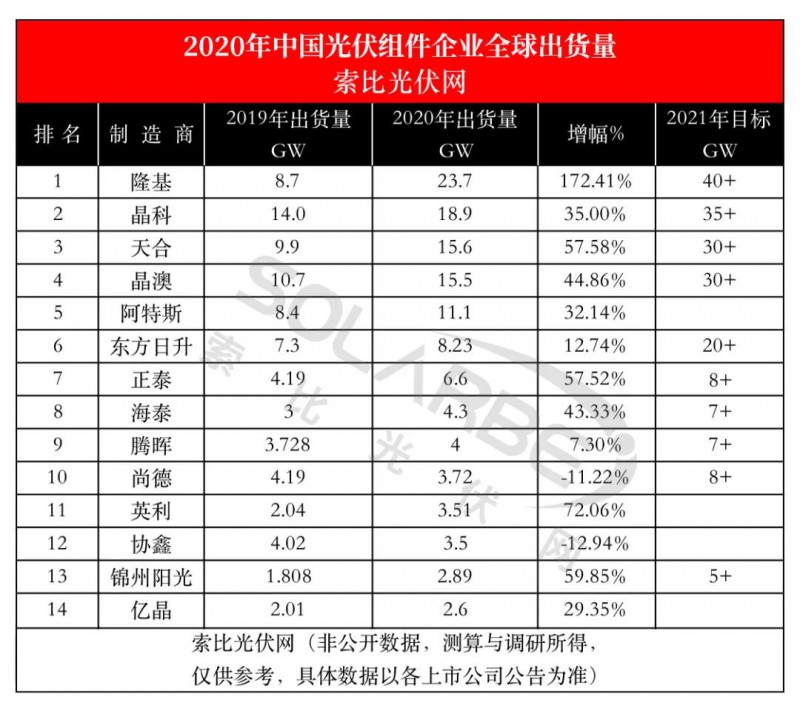 經(jīng)索比咨詢多次調(diào)研走訪,由索比咨詢分析師團(tuán)隊(duì)統(tǒng)計(jì)、測算的《2020年中國光伏組件企業(yè)全球出貨量》調(diào)研統(tǒng)計(jì)結(jié)果正式出爐(如下圖所示),以供廣大讀者參考。