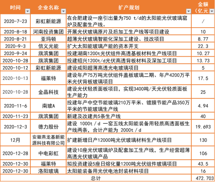 除此之外,據(jù)光伏們此前不完全統(tǒng)計,由于光伏玻璃價格一路水漲,為了保障光伏玻璃穩(wěn)定供應,2020年下半年以來,有12家企業(yè)投資了超472億元加碼光伏玻璃,其中包括信義光能、福萊特、南玻A、中電彩虹、洛陽玻璃等頭部企業(yè)。