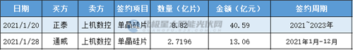 1月20日,無錫上機(jī)數(shù)控股份有限公司全資子公司弘元新材料(包頭)有限公司與正泰電器全資子公司浙江正泰太陽(yáng)能科技有限公司、海寧正泰新能源科技有限公司、鹽城正泰新能源科技有限公司、鹽城正泰太陽(yáng)能科技有限公司、海寧正泰太陽(yáng)能科技有限公司和杭州民泰進(jìn)出口貿(mào)易有限公司簽訂了單晶硅片采購(gòu)合同。2021~2023年,正泰將向上機(jī)數(shù)控采購(gòu)單晶硅片8.82億片(上下浮動(dòng)不超過10%),實(shí)際采購(gòu)價(jià)格采取月度議價(jià)方式。其中2021年預(yù)計(jì)采購(gòu)不低于2.1億片,2022年采購(gòu)3.36億片,2023年采購(gòu)3.36億片。參照PVInfolink最新公布的價(jià)格及排產(chǎn)計(jì)劃測(cè)算,預(yù)計(jì)合同金額約為三年總計(jì)40.59億元(含稅)。雙方約定,每個(gè)月月底之前簽訂次月補(bǔ)充協(xié)議,次月支付完畢相應(yīng)貨款。