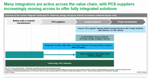 研究表明,儲(chǔ)能市場(chǎng)的競(jìng)爭(zhēng)格局正在變得多元化。由于大量的項(xiàng)目管道使現(xiàn)有的部署規(guī)模相形見(jiàn)絀,儲(chǔ)能逆變器(PCS)制造商正在擴(kuò)展針對(duì)太陽(yáng)能發(fā)電設(shè)施和儲(chǔ)能應(yīng)用的業(yè)務(wù),而新進(jìn)入市場(chǎng)的儲(chǔ)能集成商正在挑戰(zhàn)現(xiàn)有的集成商。如圖1所示,在儲(chǔ)能價(jià)值鏈的各個(gè)細(xì)分市場(chǎng)中活躍著許多參與者,尤其是逆變頻制造商紛紛轉(zhuǎn)向提供完全集成的儲(chǔ)能解決方案。