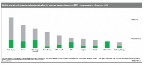 在全球范圍內(nèi),特斯拉、NEC Energy Solutions和Fluence公司一直是行業(yè)領(lǐng)先的儲(chǔ)能系統(tǒng)集成商。儲(chǔ)能系統(tǒng)集成商的未來(lái)市場(chǎng)格局將會(huì)進(jìn)一步多樣化,這主要是由儲(chǔ)能逆變器制造商擴(kuò)大其業(yè)務(wù)范圍(針對(duì)太陽(yáng)能+儲(chǔ)能應(yīng)用)以及現(xiàn)有的競(jìng)爭(zhēng)對(duì)手(例如如瓦錫蘭和Powin Energy)致力發(fā)展帶來(lái)的戰(zhàn)略機(jī)遇。與此同時(shí),NEC Energy Solutions公司最近退出儲(chǔ)能市場(chǎng)也說(shuō)明了儲(chǔ)能市場(chǎng)出現(xiàn)整合的趨勢(shì),特別是對(duì)規(guī)模較小的區(qū)域性參與者來(lái)說(shuō),面臨整合的挑戰(zhàn)。主要的儲(chǔ)能系統(tǒng)集成商的業(yè)務(wù)正在轉(zhuǎn)向全球化,并可以根據(jù)其運(yùn)營(yíng)規(guī)模提供更具成本效益的解決方案。圖2概述了部分儲(chǔ)能系統(tǒng)集成商當(dāng)前已經(jīng)部署的儲(chǔ)能系統(tǒng)和計(jì)劃部署的儲(chǔ)能項(xiàng)目(數(shù)據(jù)來(lái)自截至2020年8月的IHS Markit公司全球儲(chǔ)能項(xiàng)目數(shù)據(jù)庫(kù))。