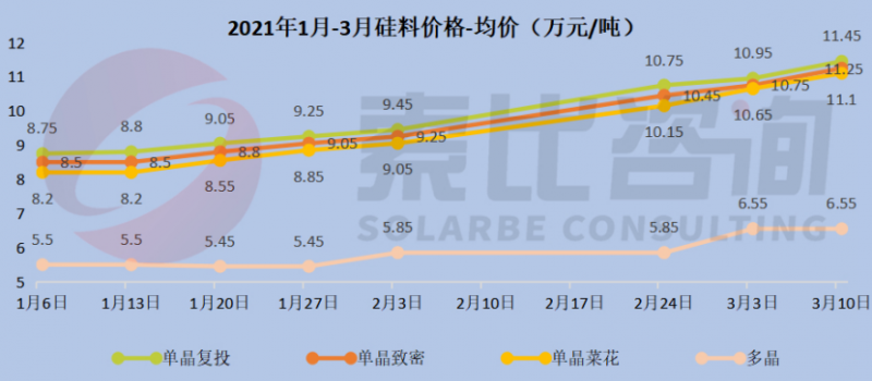 單晶復(fù)投均價11.45萬元/噸,環(huán)比上漲4.57%,近三周平均漲幅6.73%,最高成交價11.90萬元/噸,預(yù)計下周最高價將突破12萬元/噸;