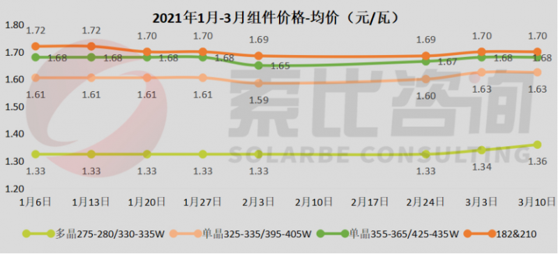 182mm組件和210mm組件,均價1.70元/瓦,最高成交價1.75元/瓦。
