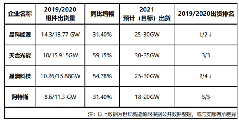 組件巨頭年報紛紛發(fā)布,隆基雖然年報數(shù)據(jù)仍未披露,但在2020年年底,其公布2020年組件出貨量達20GW+,相較于2019年8.4GW組件出貨量,增長138%+。從全球第四位躍居榜首。