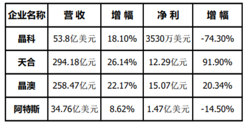 從晶科、天合、晶澳、阿特斯年報不難發(fā)現(xiàn),各家營收額全面上浮。晶科營收晶科營收53.8億美元(約合352.6億元人民幣),同增18.10%;天合營收294.18億,同增26.14%;晶澳營收258.47億,同增22.17%;阿特斯營收34.76億美元(約合227.5億元),同增8.62%。