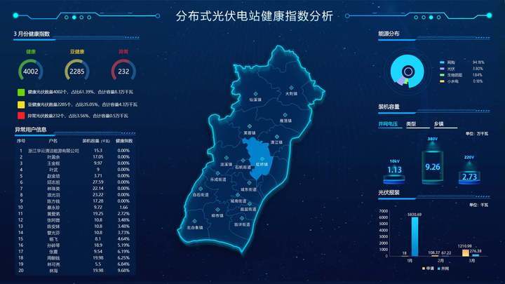 為此,國(guó)網(wǎng)溫州供電公司開(kāi)展分布式光伏健康指數(shù)研發(fā),通過(guò)監(jiān)測(cè)全市范圍內(nèi)的光伏發(fā)電站發(fā)電量,結(jié)合裝機(jī)容量、安裝地域等因素,將年發(fā)電量和月發(fā)電量分別與理論值、平均值進(jìn)行比較,通過(guò)時(shí)監(jiān)測(cè)、日對(duì)比、周分析,研判光伏電站運(yùn)行工況。分析評(píng)價(jià)結(jié)果綠色代表“健康”,黃色代表“亞健康”,紅色代表“異常”,最終出具詳細(xì)的診斷分析報(bào)告,輔助分布式光伏業(yè)主開(kāi)展運(yùn)維管理。
