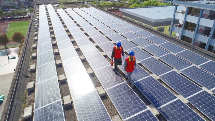 國(guó)網(wǎng)樂(lè)清市供電公司員工對(duì)樂(lè)清市大荊鎮(zhèn)中心小學(xué)的分布式光伏發(fā)電設(shè)備開(kāi)展日常運(yùn)維工作。
