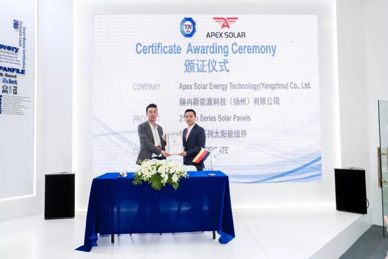 中國/上海 ,6月3日,在第十五屆(2021)國際太陽能光伏與智慧能源(上海)展覽會暨論壇期間, TÜV南德意志大中華集團(以下簡稱“TÜV 南德”)為赫冉新能源科技(揚州)有限公司(以下簡稱“赫冉新能源”)所展出的210單玻產品頒發(fā)TÜV 南德認證證書。TÜV南德智慧能源高級運營總監(jiān)以及首席簽證官張祝林、赫冉新能源董事長陳建輝等一席嘉賓出席了該頒證儀式。