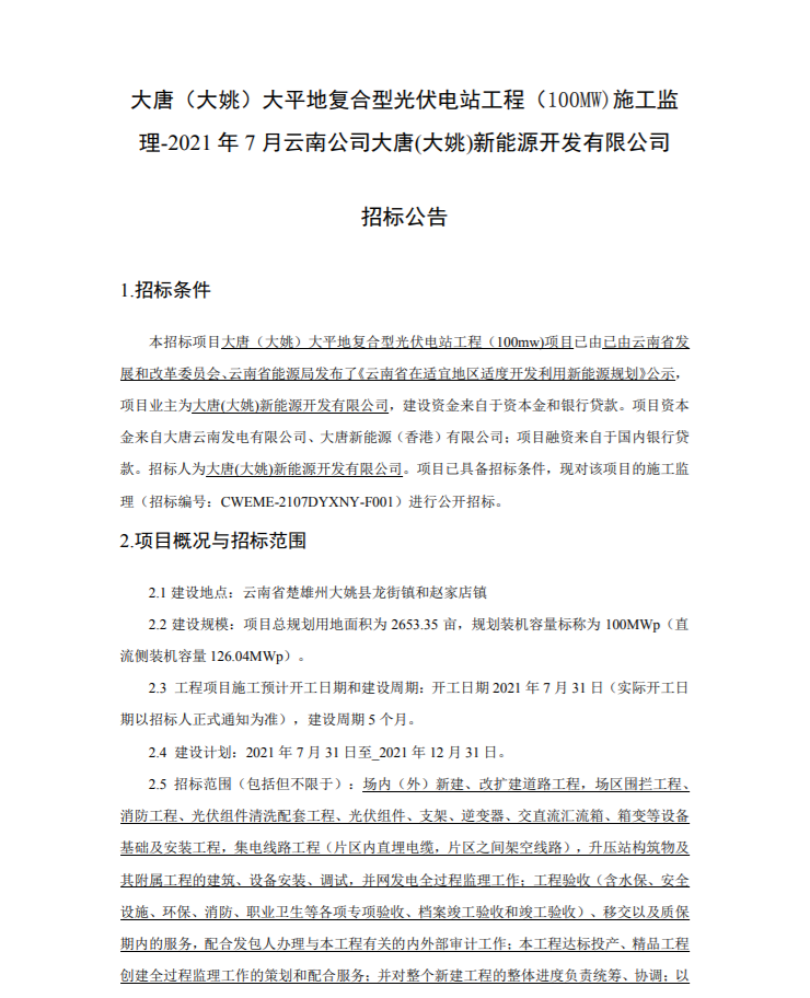 大唐(大姚)大平地復(fù)合型光伏電站工程(100MW)施工監(jiān)理招標公告