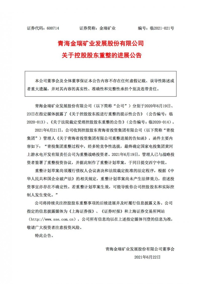 6月22日,青海省投資集團(tuán)旗下上市企業(yè)金瑞礦業(yè)發(fā)布《關(guān)于控股股東重整的進(jìn)展公告》,公告表示,青投集團(tuán)重整過程中,經(jīng)多輪競爭性選拔,最終確定國家電投集團(tuán)黃河上游水電開發(fā)有限責(zé)任公司為重整戰(zhàn)略投資者。2021年6月19日,管理人已與戰(zhàn)略投資者簽署了重整投資協(xié)議,并據(jù)此制作了重整計劃草案,于同日提交西寧中院。