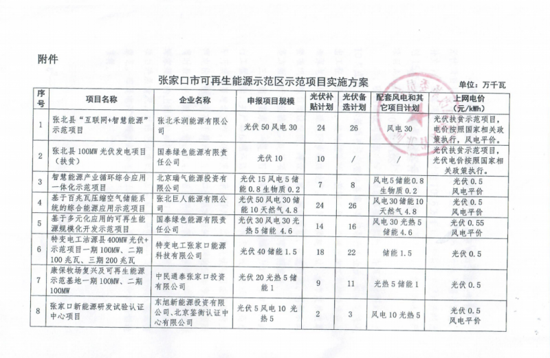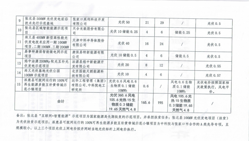據(jù)過往資料查詢,2018年10月,《張家口可再生能源示范區(qū)示范項(xiàng)目實(shí)施方案》印發(fā),共安排15個(gè)項(xiàng)目,光伏發(fā)電規(guī)模為3.606GW,有補(bǔ)貼計(jì)劃為1.656GW,備選規(guī)模為1.95GW;配套風(fēng)電1.056GW、儲(chǔ)能項(xiàng)目196.5MW以及其他光熱、生物質(zhì)項(xiàng)目等。