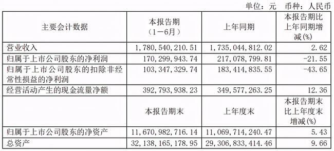 本次年中報告顯示,公司上半年實(shí)現(xiàn)營業(yè)收入約17.81億元,同比增長2.62%;歸屬于上市公司股東的凈利潤約1.70億元,同比下降21.55%;扣非凈利潤為1.03億元,同比下降43.65%。