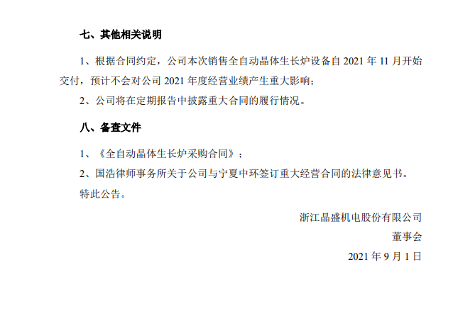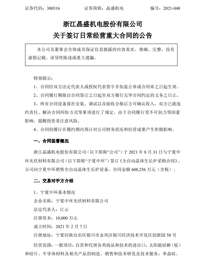 9月1日,晶盛機電發(fā)布關于簽訂日常經營重大合同的公告。