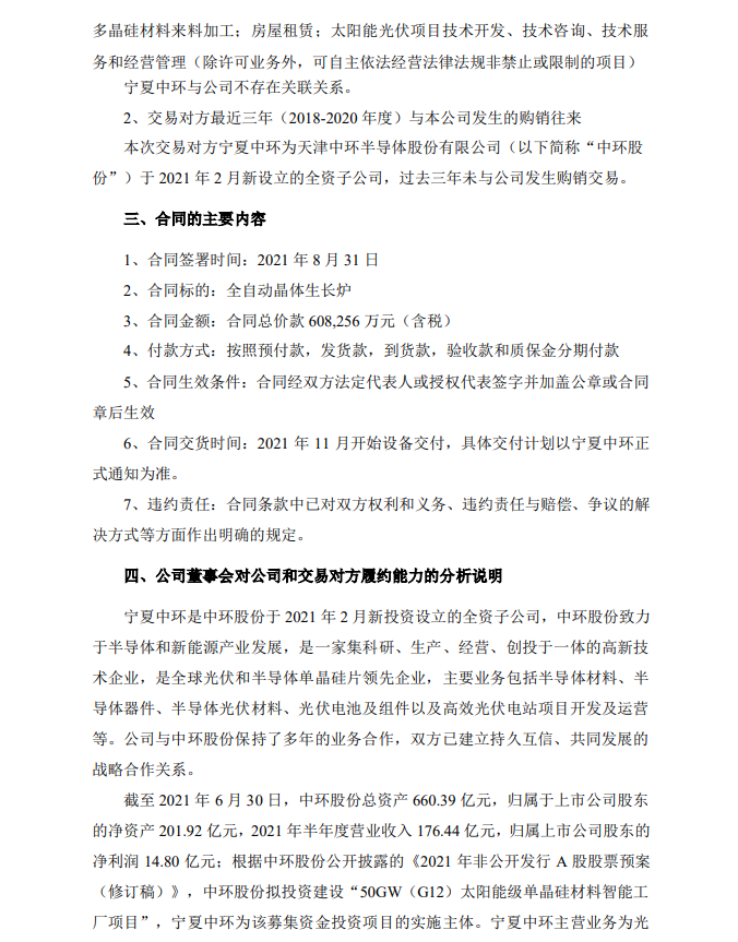 公告稱,8月31日,晶盛機電與寧夏中環(huán)簽訂《全自動晶體生長爐采購合同》,向寧夏中環(huán)銷售全自動晶體生長爐設備,合同金額 60.8256 億(含稅)。規(guī)定2021年11月開始設備交付,具體交付計劃以寧夏中環(huán)正式通知為準。