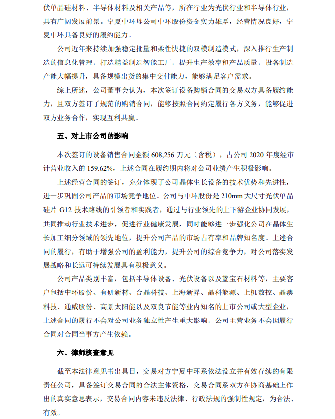 晶盛機電稱,本次簽訂的設備銷售合同金額占公司 2020 年度經審計營業(yè)收入的 159.62%,合同在履約期內將對公司業(yè)績產生積極影響。本次合同的簽訂,充分體現(xiàn)了公司晶體生長設備的技術優(yōu)勢和先進性,進一步鞏固公司產品的市場競爭地位。公司與中環(huán)股份是 210mm大尺寸光伏單晶硅片 G12 技術路線的引領者和實踐者,通過與行業(yè)領先的上下游企業(yè)協(xié)同發(fā)展,共同推動行業(yè)技術進步,促進行業(yè)健康發(fā)展,同時能夠進一步強化公司在晶體生長加工細分領域的領先地位,提升公司產品的市場占有率和品牌知名度。上述合同的履行,有助于增強公司的盈利能力,提升公司的綜合競爭力,對公司落實發(fā)展戰(zhàn)略和長遠可持續(xù)發(fā)展具有積極意義。