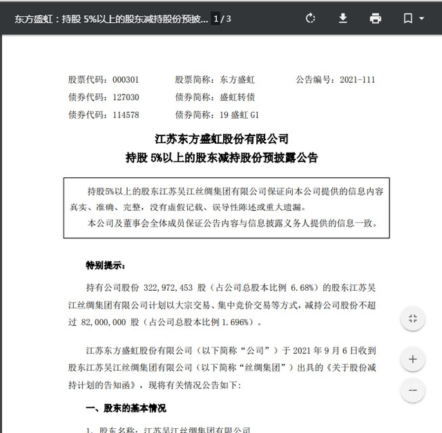 9月6日晚間,目前炙手可熱的光伏概念巨頭東方盛虹發(fā)布減持預(yù)披露公告,公告稱原大股東江蘇吳江絲綢集團(tuán)有限公司(吳江絲綢)計(jì)劃減持不超過 8200萬股,占公司總股本比例1.696%。按照最新收盤價(jià)計(jì)算,合計(jì)套現(xiàn)市值約26億元。