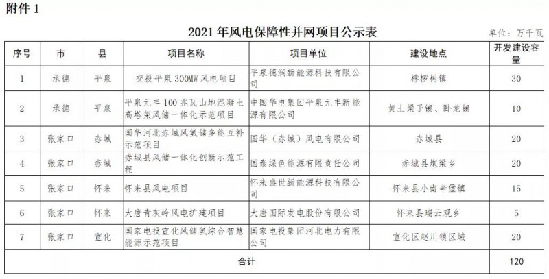 根據(jù)《關(guān)于做好2021年風(fēng)電、光伏發(fā)電開發(fā)建設(shè)有關(guān)事項(xiàng)的通知》(冀發(fā)改能源〔2021〕885號)要求,經(jīng)各市組織評審、電網(wǎng)公司對接入和消納條件確認(rèn)及第三方咨詢單位對基本要件審核,現(xiàn)對全省2021年風(fēng)電、光伏發(fā)電保障性并網(wǎng)項(xiàng)目予以公示。本次擬安排風(fēng)電項(xiàng)目7個(gè)、120萬千瓦,光伏發(fā)電項(xiàng)目78個(gè)、1141.08萬千瓦,具體名單見附件。