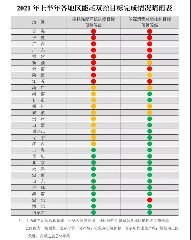 所謂“能耗雙控”政策,是指能源消費強度和總量雙控的相關(guān)政策。今年以來,對“能耗雙控”的考核一直比較嚴(yán)格。國家發(fā)展和改革委員會印發(fā)的《2021年上半年各地區(qū)能耗雙控目標(biāo)完成情況晴雨表》顯示,在能耗強度降低方面,青海、寧夏、廣西、廣東、福建、新疆、云南、陜西、江蘇9個省(區(qū))上半年能耗強度不降反升,被列為紅色的一級預(yù)警;在能源消費總量控制方面,青海、寧夏、廣西、廣東、福建、云南、江蘇、湖北8個省(區(qū))被列為紅色的一級預(yù)警。